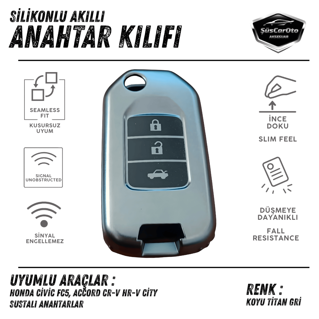 Honda Civic FC5 Accord CR-V HR-V City Sustalı Anahtar Uyumlu Silikon Anahtar Kılıfı Oto Anahtar Kabı Darbe Emici Anahtarlık Koyu Titan Gri | ŞüsCarOto Aksesuar