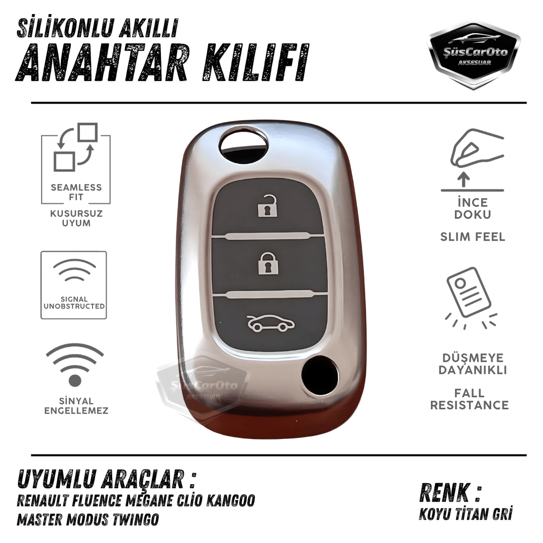 Renault Fluence Megane Clio Kangoo Master Modus Twingo Sustalı Anahtar Uyumlu Silikon Anahtar Kılıfı Oto Anahtar Kabı Darbe Emici Anahtarlık Koyu Titan Gri | ŞüsCarOto Aksesuar