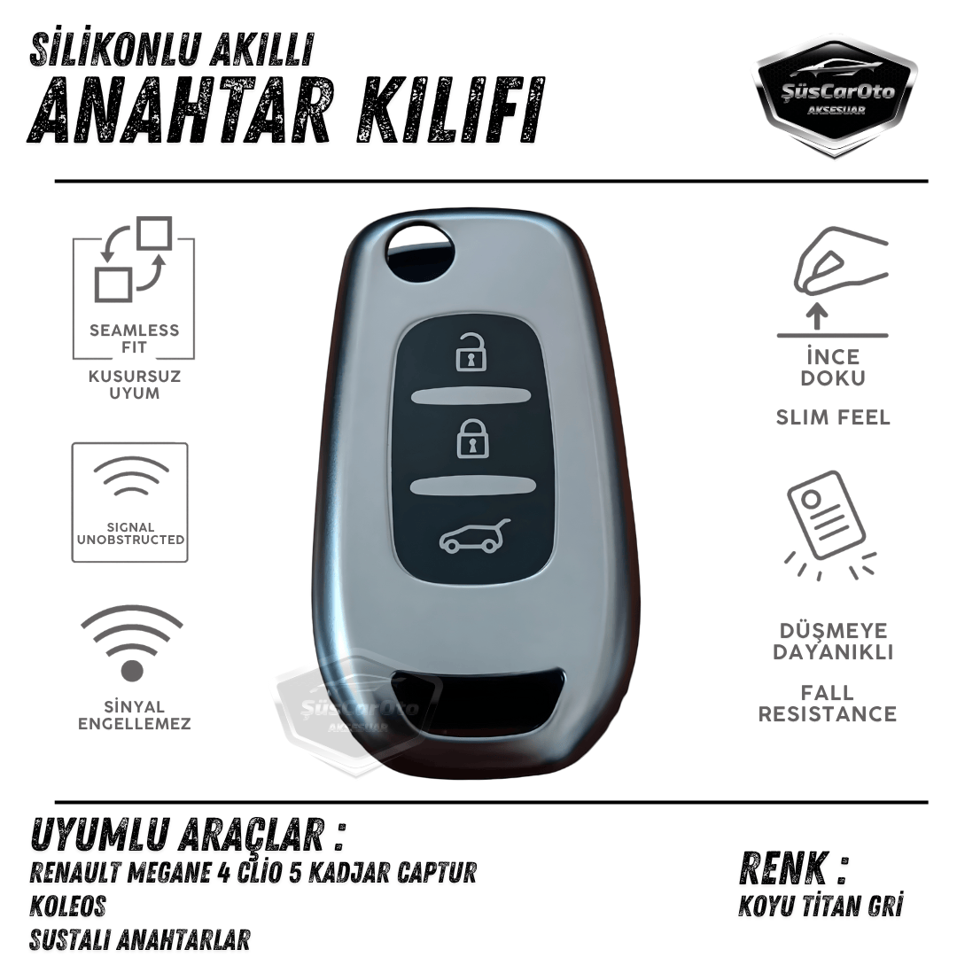Renault Megane 4 Clio 5 Kadjar Captur Kaleos Sustalı Anahtar Uyumlu Silikon Anahtar Kılıfı Oto Anahtar Kabı Darbe Emici Anahtarlık Koyu Titan Gri | ŞüsCarOto Aksesuar